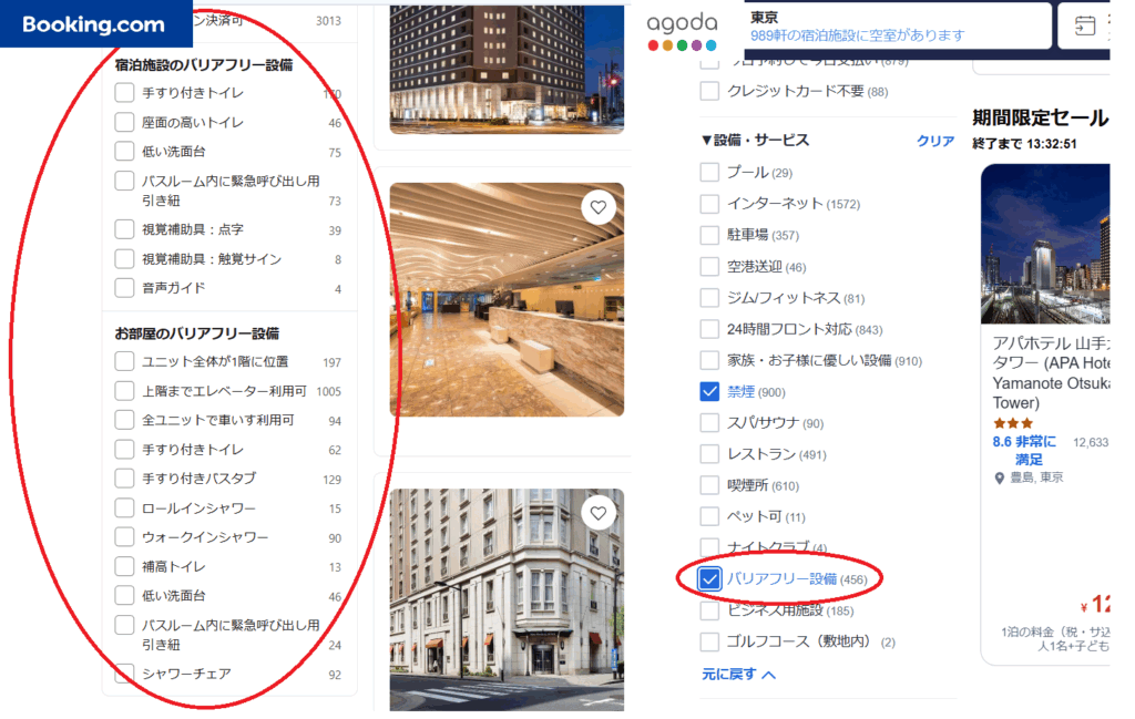 - 🔗agodaでは、「▼設備・サービス」の項目で、[バリアフリー設備]にチェックを入れて検索できます。