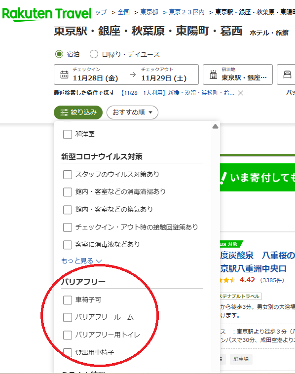 ・検索結果されたページの右上にある[絞り込み]をクリックし、下にスクロールすると 「バリアフリー」 に関するチェックボックスがあります。