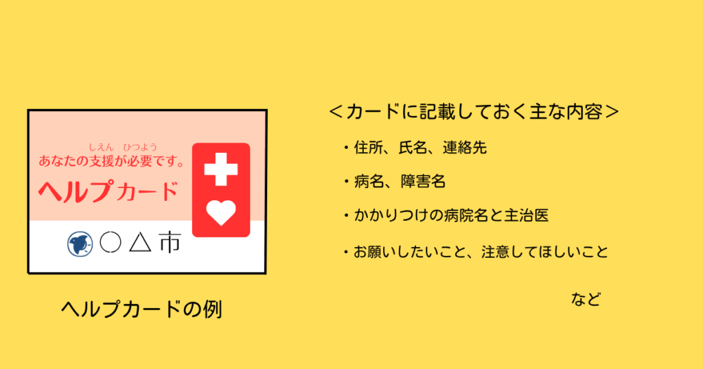 「ヘルプカード」は、困ったときや緊急時に、まわりの人へ必要なサポートや連絡先を伝えるためのカードで、あらかじめ自分の情報を記入して、避難や外出時に持ち歩くと安心です。