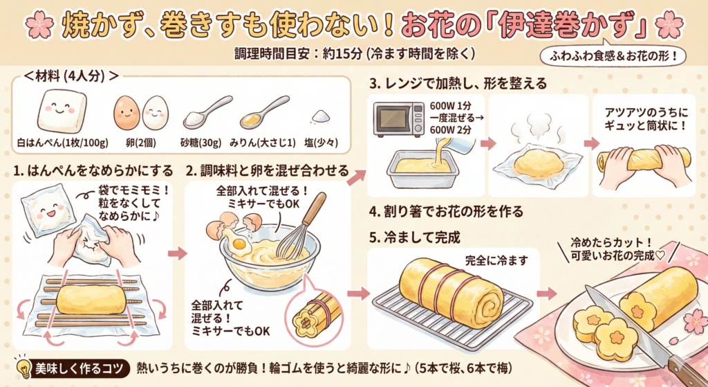 焼かず、巻きすも使わないお花のカタチにできる「伊達巻かず」。縦16×横8×高さ8cmの耐熱容器があるとベスト!