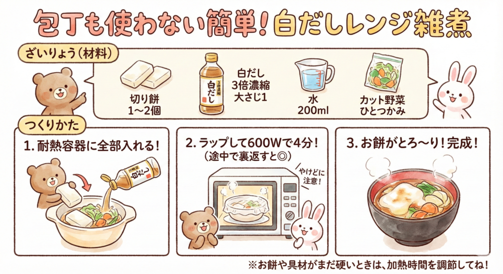 お出汁&お餅焼かないバージョン!材料を入れて電子レンジでチンするだけ!